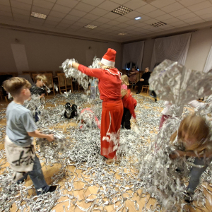 Dzieci chętnie uczestniczyły w animacjach i wspólnych tańcach, a atmosfera była pełna śmiechu i pozytywnej energii. W trakcie spotkania uczestnicy mogli również poczęstować się m.in. pyszną pizzą – którą dostarczyła nam pizzeria LOLO z Połomi, która szybko znikała z talerzy i dodawała energii do dalszej zabawy. Najważniejszym punktem programu była oczywiście wizyta świętego Mikołaja, który przywitał każde dziecko i wręczył im świąteczne prezenty, a dzieci mogły sobie zrobić z nim pamiątkowe zdjęcie.